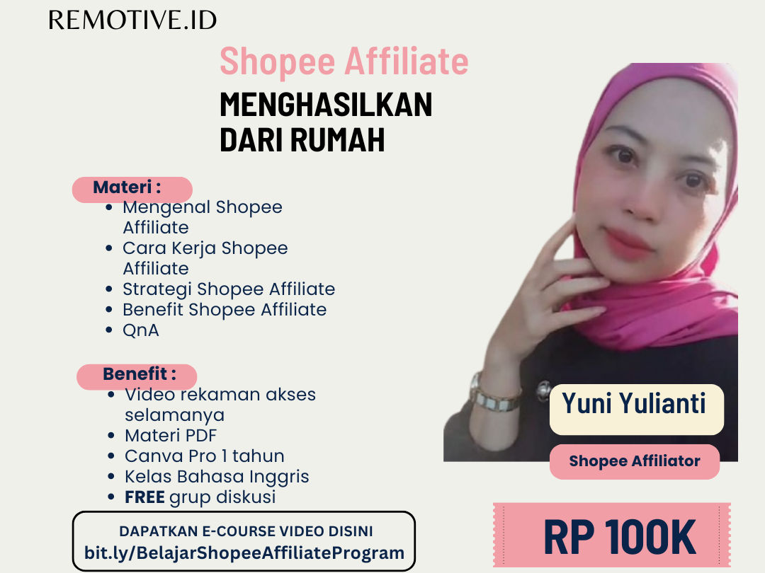 Pelajari tentang kerja remote dalam kelas online keren persembahan dari REMOTIVE.ID dan Anggita Novria; dengan pemateri Yuni Yulianti, seorang Shopee Affiliate! ๐